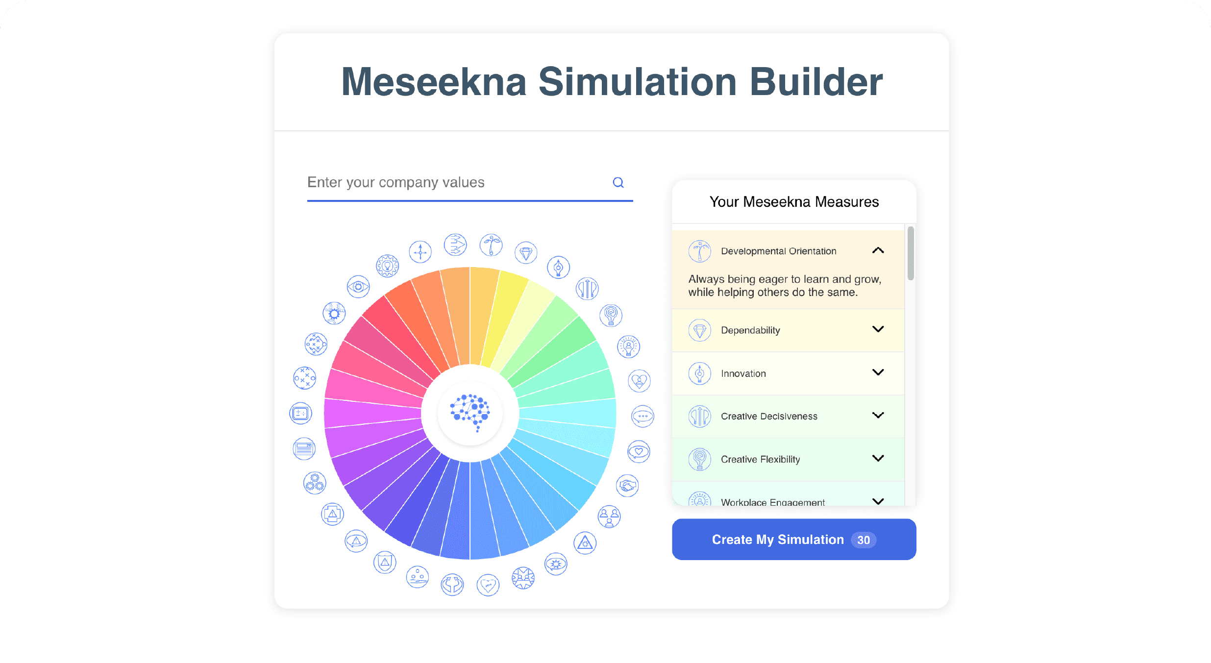 Transform your company values into predictive cognitive analytics using our science-backed simulation—7x more accurate than traditional methods—to reveal the cognitive patterns driving performance.